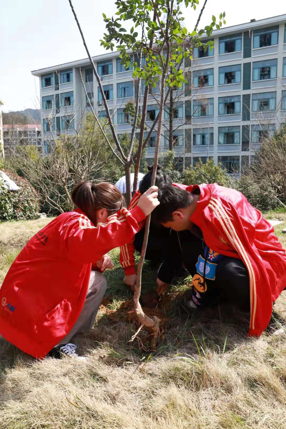 植树活动中,同学们分工合作,挖坑、栽植、填土、浇水,大家都热情高昂,齐心协力,撸起袖子加油干,挥舞铁锹翻新土,将一棵棵充满生机和希望的树苗植入土中。