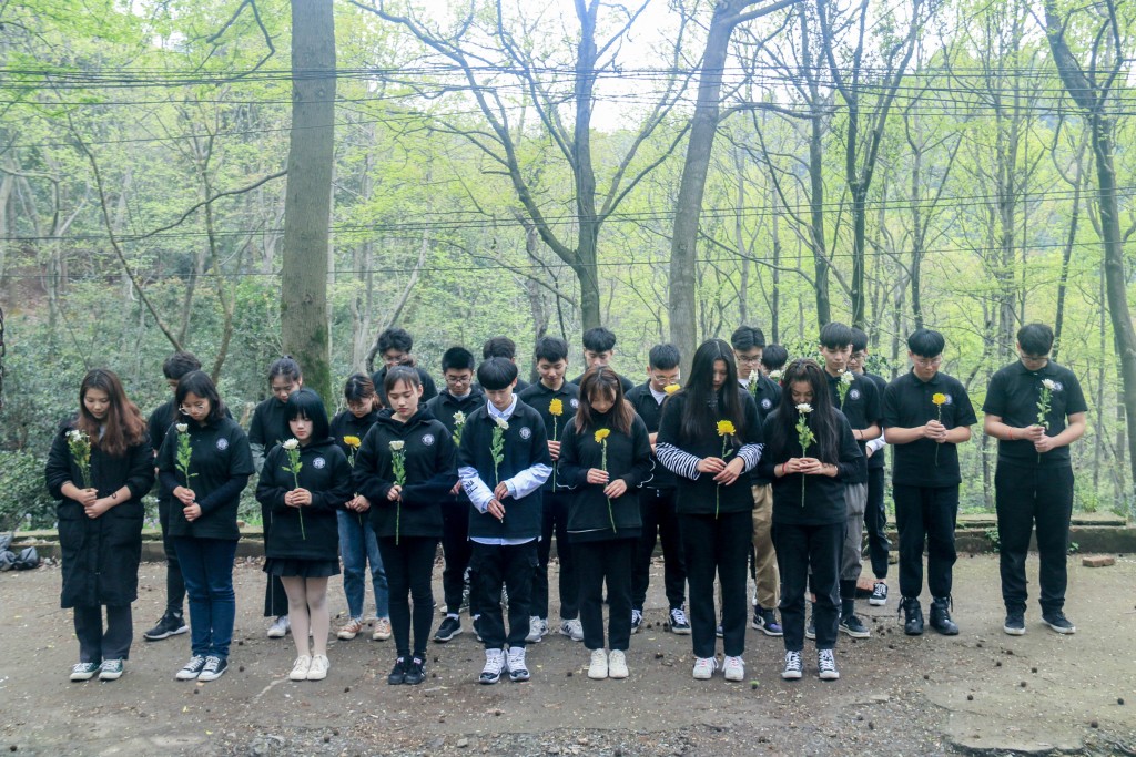 在千人坑遗址纪念碑前,学生干部们先是为遗址周围清扫垃圾,然后由学生代表在“勿忘国耻”纪念地前朗诵祭文,带领大家对逝者进行缅怀和追思,并向为了实现最广大人民群众的根本利益,不惜舍身取义的无名英雄们敬献菊花并默哀,以表达对逝者深深地敬仰和缅怀之情。