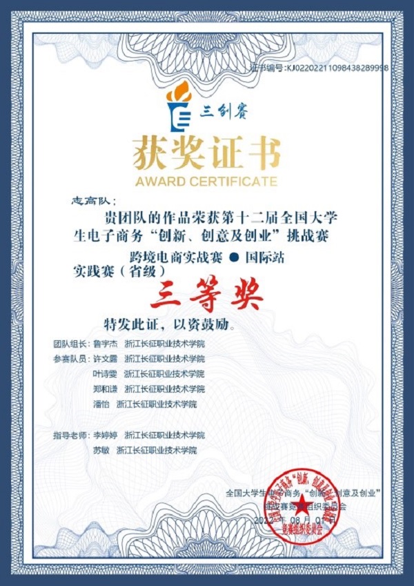 第十二届全国大学生电子商务“创新、创意及创业”挑战赛(简称“三创”赛)跨境电商实战赛实践赛(省赛)于2022年4月16日至6月30日举行,学校共有8支队伍晋级实践赛环节,经过2个半月的激烈角逐,由汪淑芳、杨翠香、吴小平、陈露、钟燕、李婷婷、包国华、苏敏等老师指导的5支队伍荣获国际站实践赛道省级三等奖。