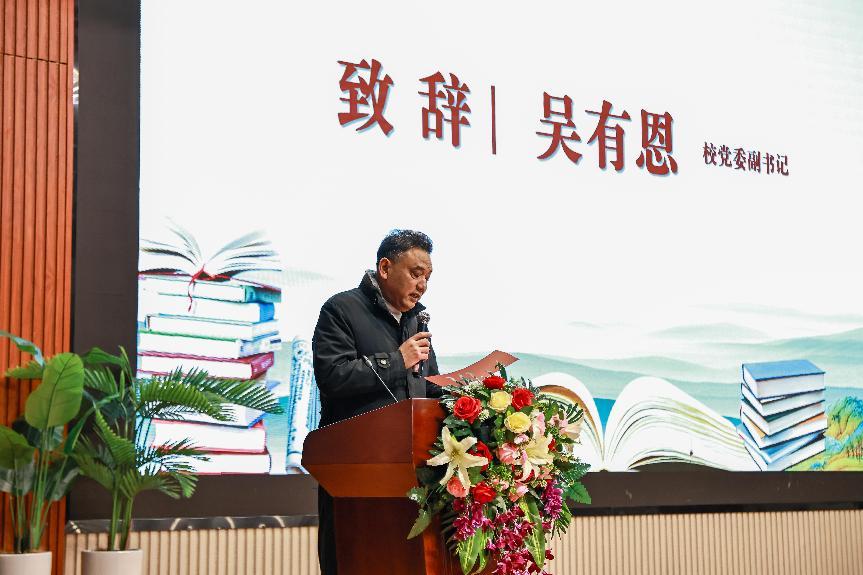 学校党委副书记吴有恩代表学校向读书节的开幕表示热烈祝贺。他表示,读书与创作是校园文化建设的重要基石,号召全体师生以阅读为媒、以创作为翼,共同构建充满书香气息的文化育人环境。他指出,读书节及创作大赛这两项活动的开展,既是对传统文化的传承创新,也是提升师生人文素养的重要实践。