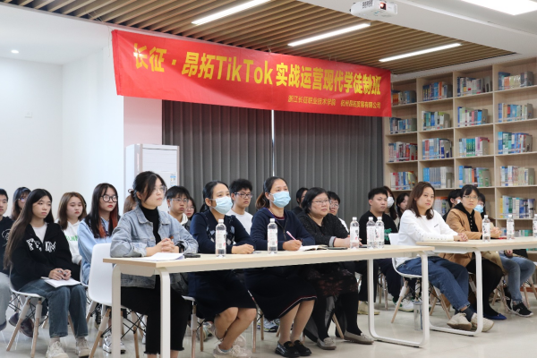 为使跨境电子商务专业群的学生能够对TikTok Shop有更全面、深入的认知,获得真实的TikTok Shop短视频运营和跨境直播实战机会,并且在跨境电商领域的专业技能和创业能力方面得到提升,商贸学院与杭州昂拓贸易有限公司共同启动了基于TikTok 实战运营的跨境电商现代学徒制班项目,并于近日在学校图书馆举行了开班仪式,教务处副处长吴少俊、商贸学院院长王珍、杭州昂拓贸易有限公司副总经理许新、跨境电商运营总监金开,商务与贸易学院教师代表和20位学徒制班学员参加了此次开班仪式。