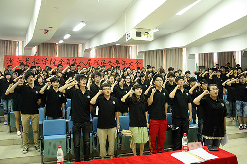 随后,我院全体志愿者进行了宣誓仪式,志愿者们铿锵有力的宣读出自己的誓言,以强大的凝聚力及团结奋进的精神展示了我院志愿者服务第八届残运会的坚强决心和满腔热情。